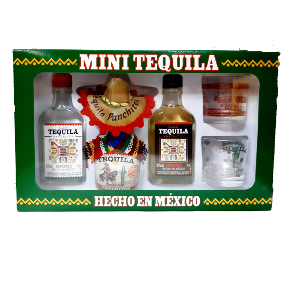 Estuche Mini Tequila + Vasos Campeny, compuesto por 1 botella de tequila Ranchitos reposado, 1 tequila ranchitos blanco y 1 tequila Panchitos blanco mas 2 vasos.
